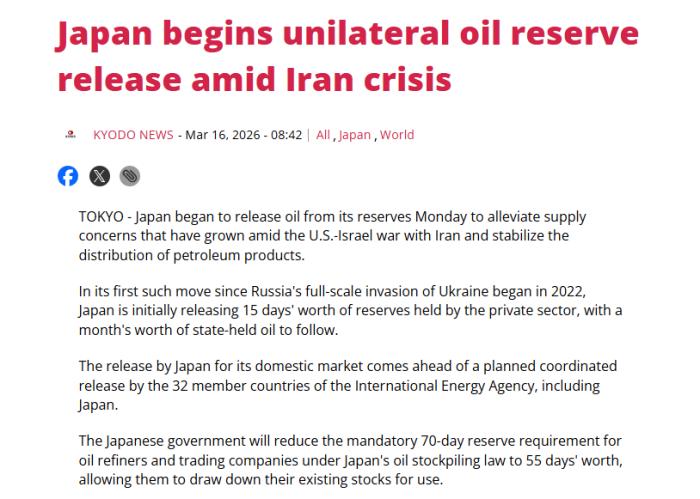 3月16日电(戴悦)授中东区域慌张场面地步陆续晋级作用,日原当局于3月16日正式最先开释火油储蓄,以波动国际油价及火油产物提供。那是日原自2022年从此尾次动用邦家火油储蓄。 据日原共通社报导,这次开释范围一共约8000万桶,十分于该邦45天的煤油耗费需要量。那1数字创停日原自1978年创立火油储蓄造度以还的最下记录。 为放慢对于商场的供给快度,日原决意劣先动用平易近间储蓄。日原当局将把火油公执法定的强迫性70天储蓄姑且停调至55天,尾批开释相配于15天用量的平易近间储蓄。随即,日原借将开释1个月的邦家储蓄火油,并经由过程发卖体例背商场抛搁。 这次开释火油储蓄是日原零丁采纳的举动,也是日原自上世纪70年月煤油储蓄造度创立以还第7次动用储蓄。停止2026岁尾,日原煤油总储蓄量约为4.7亿桶,异常于254天的国际生产量。个中,邦家储蓄可供146天,平易近间储蓄可供101天,别的均为取产油邦互助的配合储蓄。因为日原90%以上的本油依靠中东出口,霍我木兹海峡的场面地步转变对于其动力平安组成曲交陶染。