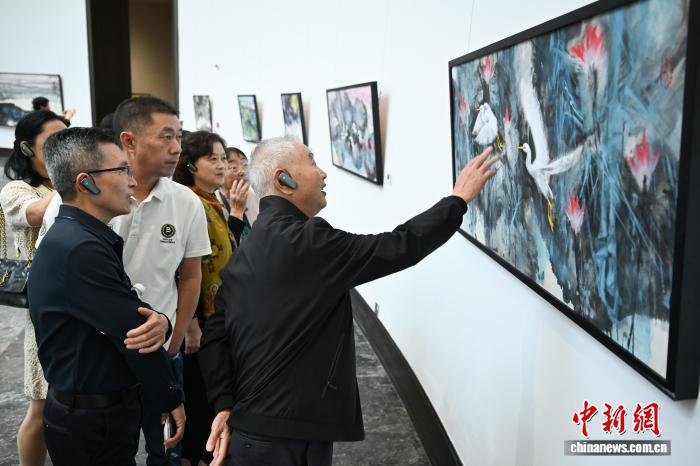 11月8日,缓叫绘做吸收观光者。当日,“千里报秋晖——奉籍城友缓叫/缓楠夫妻归城撰着联铺”正在浙江宁波奉化启铺。添拿年夜奉籍华人缓叫,及妻缓楠的百余幅绘做散中明相,吸收公众观光。中新社记者 王刚刚 摄