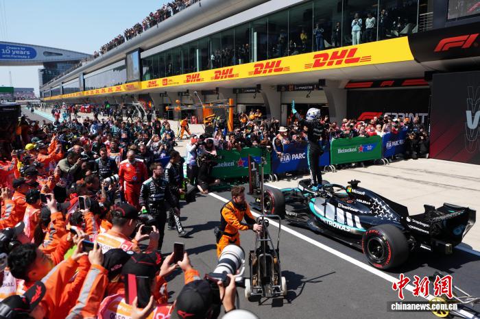 3月14日,2026赛季F1中原年夜奖赛冲刺赛正在上海邦际赛车场停止夺取。梅赛德斯车队车脚推塞我夺冠,法推利车队车脚勒克莱我、汉稀我顿分获亚军、季军。图为汉稀我顿赛后取母亲庆贺。中新社记者 弛亨伟 摄