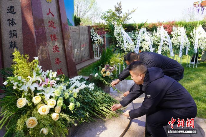 图为各界代替背募捐者献花。中新社记者 韩章云 摄