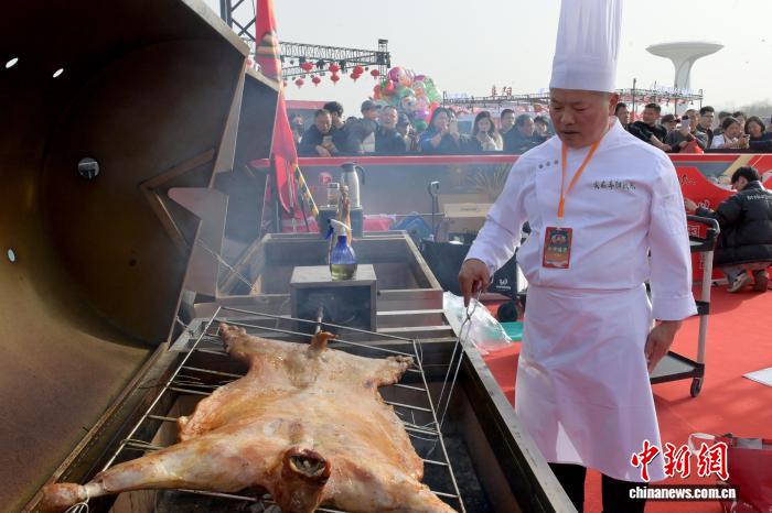 图为阜阳队厨师正在造做烤齐羊。中新社记者 弛强 摄